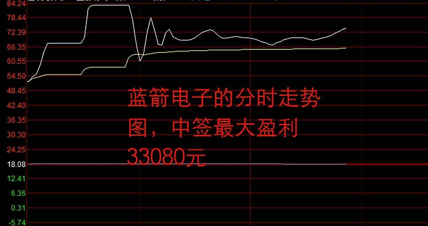 有了这些大涨新股在打样,蓝箭电子在开盘阶段就被股民大肆追捧了。蓝箭电子的开盘价为52元,较发行价18.08元高开187.6%。随后,蓝箭电子的股价就一路走高,触发了罕见的两次涨幅临停条件。截至发文,蓝箭电子最高上涨365.93%至84.24元,若有中签股民在此价位卖出的话,中签最大盈利为33080元,妥妥的一枚新股大肉签!