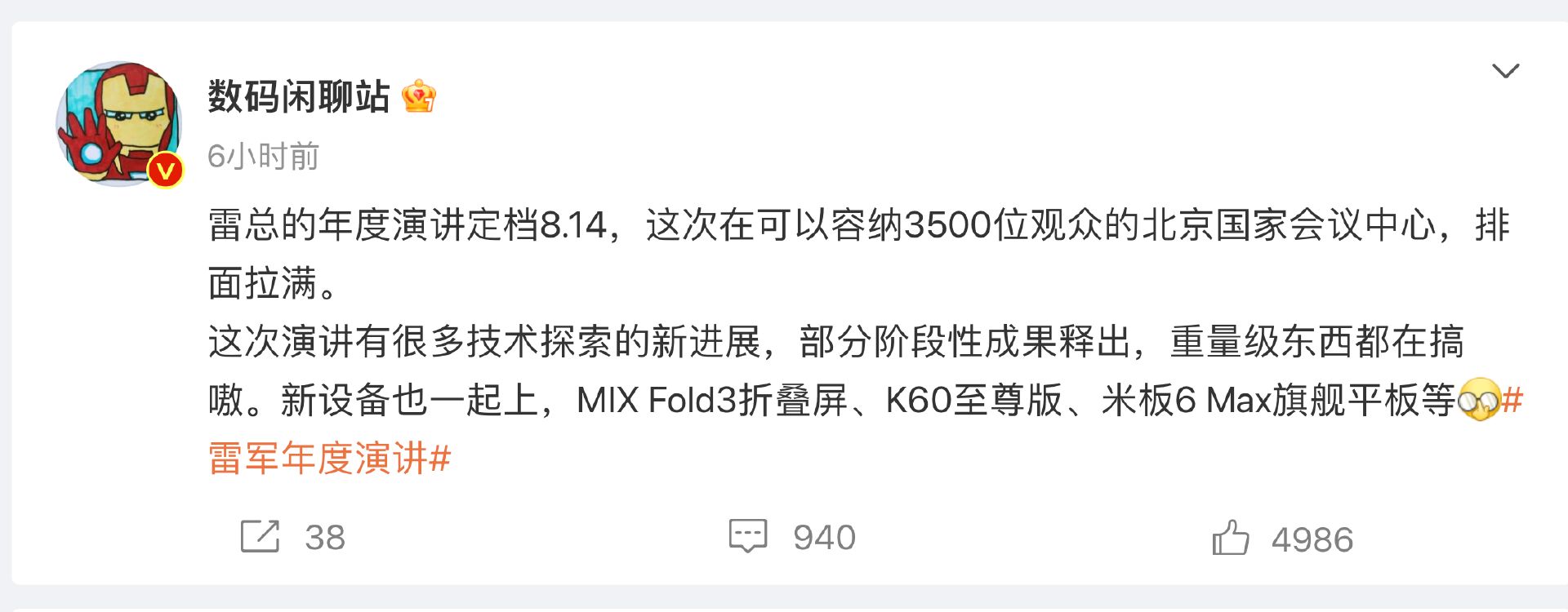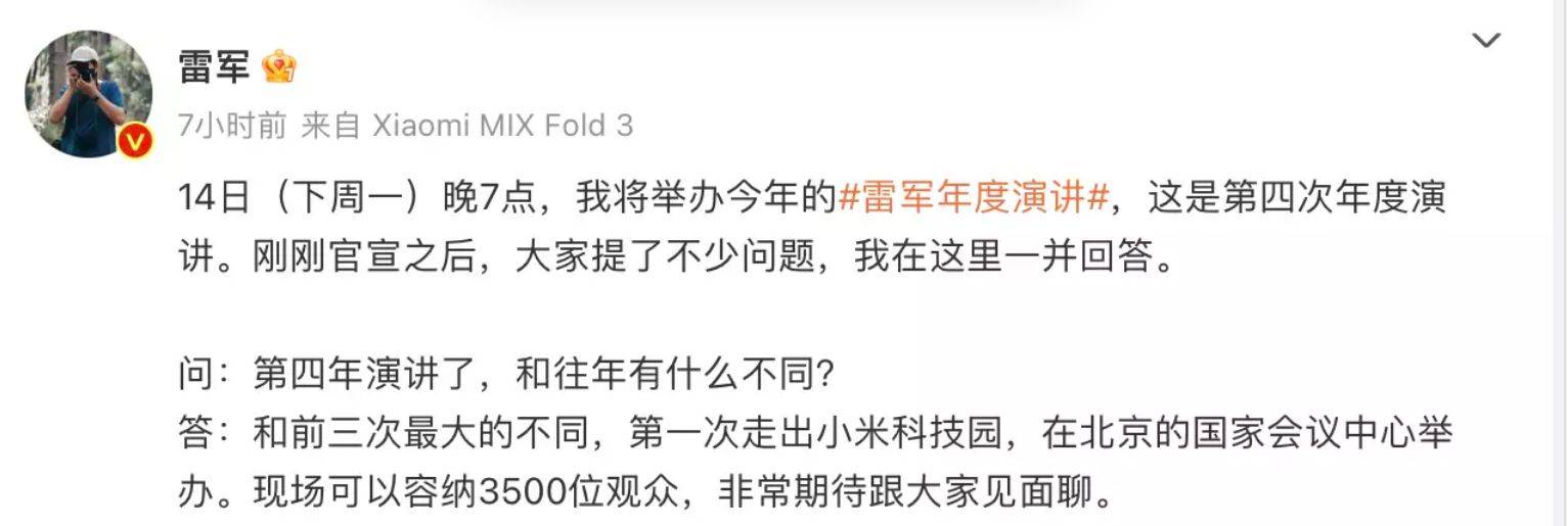 根据雷军的透露,这次要分享的故事有很多,演讲的总时长会达到3个小时。毫无疑问,这次的演讲必然会有很多看点,不然一个小时就可以讲完了;不过话又说回来,雷军一下子要讲那么多,演讲稿估计是打磨再打磨,不然整场演讲效果也会变差,在这里不得不佩服雷军的演讲能力。