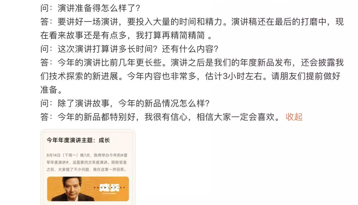 根据以往的惯例,2023年雷军演讲也不会缺席,这不近日消息称正式定档在8月14日,据官方透露,今年的“科技春晚”主题为《成长》,字面意思很好理解,猜测是小米企业成长的过程又或是雷军的成长心路历程。那么此次演讲到底有什么亮点呢?在这里,简单分析下