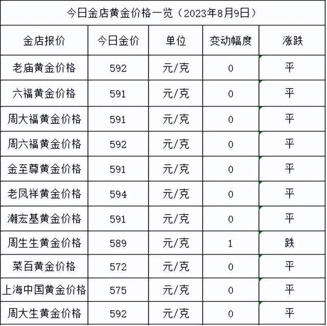 今天是8月9日,金店黄金价格依旧很稳,价格依旧很高,只有周生生微跌1元/克,其他金店价格保持不变。目前,金价最高的金店为老凤祥,价格不变,报价594元/克。而金价最低的金店依旧为菜百,不涨不跌,报价572元/克。今日黄金价格高低差为22元/克,价差较大。