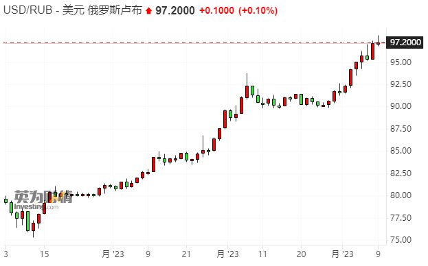 日内,美元兑卢布自2022年3月25日以来首次突破98,最高达到98.04;欧元兑卢布也一度时隔近16个月升至107关口上方。在俄罗斯央行公布消息后,美元兑卢布回落到97.20,欧元兑卢布现报106.34。