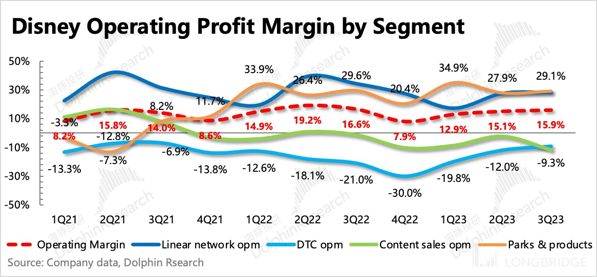 减少流媒体的亏损,给集团整体带来盈利改善是 Iger 回归的第一大重任。三季度在流媒体继续明显减亏的情况下,整体集团的盈利能力环比进一步提高,从 15.1% 提升至 15.9%。