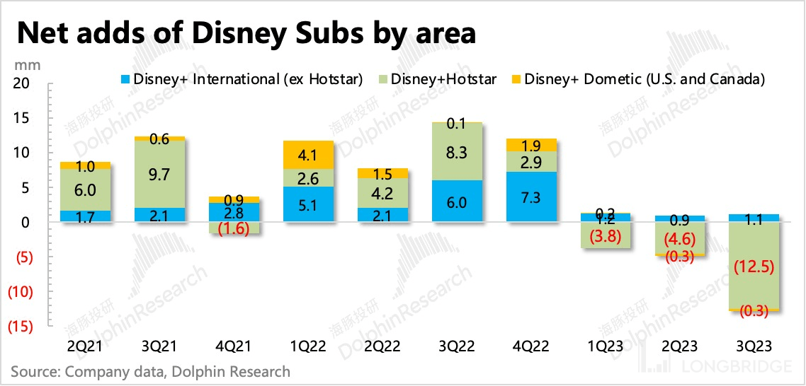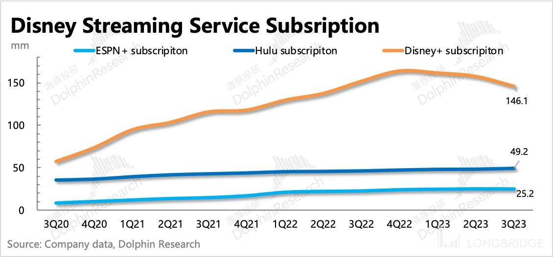 三季度是受到失去印度 IPL 版权内容影响的完整季度,因此用户流失幅度显著加大(-1250 万),也超出了市场预期。再加上三季度本身 Disney+ 的内容储备也比较一般,本土市场的用户仍在小幅流失,使得最终 Disney+ 的订阅用户环比净流失了 1170 万人,用户规模缩减至 1.46 亿,离 2.3 亿的中长期目标更远了。