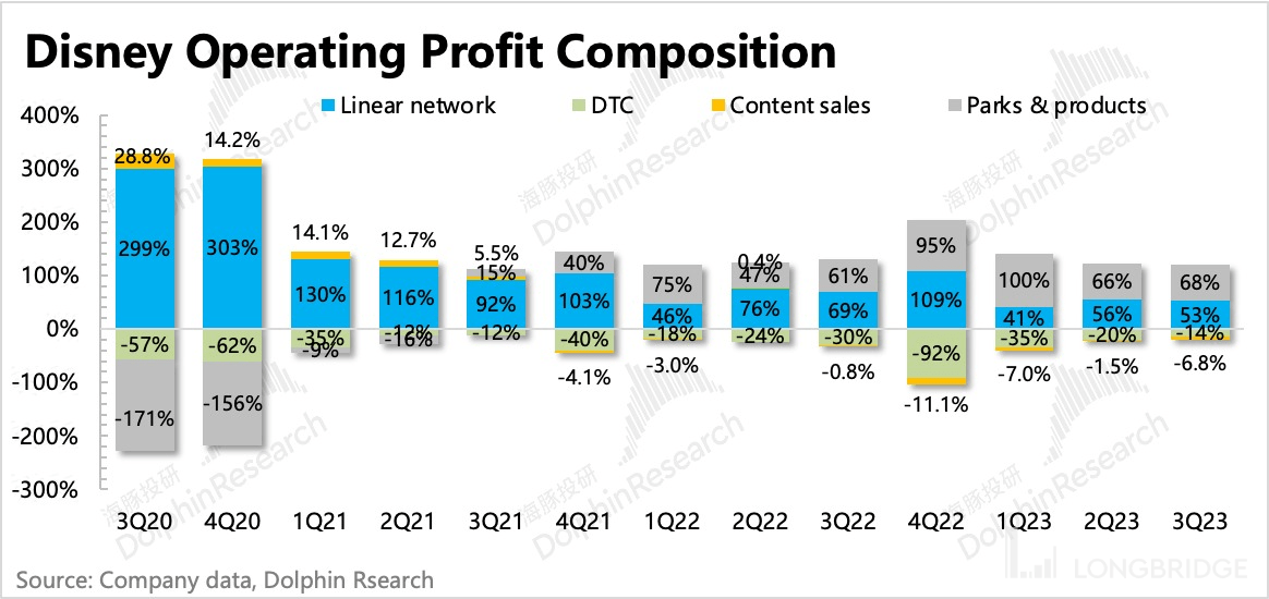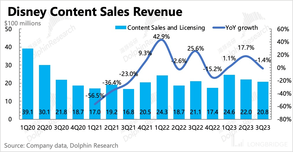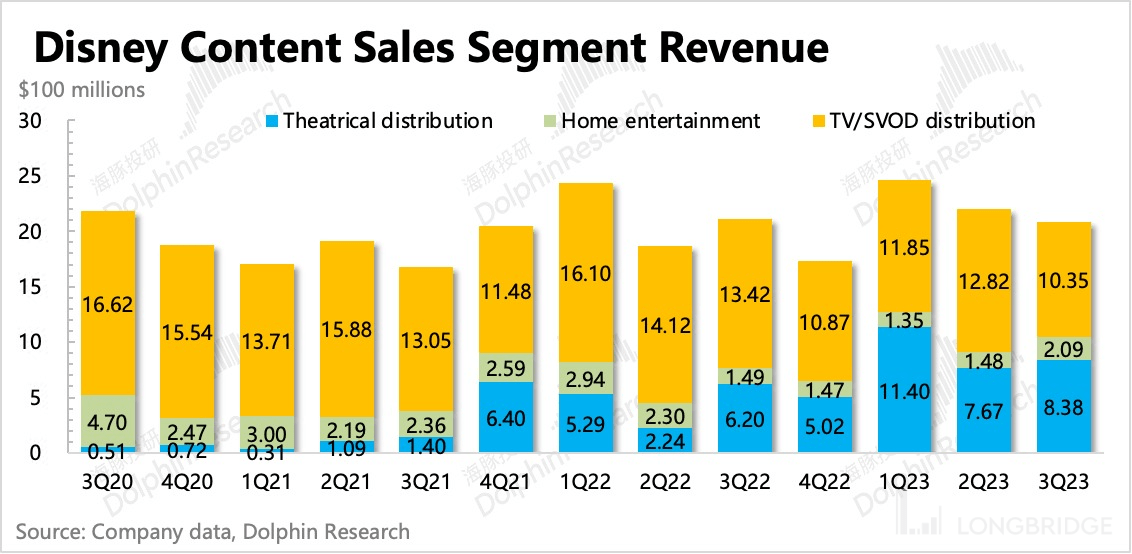 流媒体大幅减亏后,对整体盈利能力的拖累也明显缩小,但三季度内容销售业务因为当期上映的部分影片票房不佳,以及《Indiana Jones and the Dial of Destiny(夺宝奇兵 5)》在季末上映,相关的成本费用均在提前确认,但票房未计全,因此利润率环比走弱。