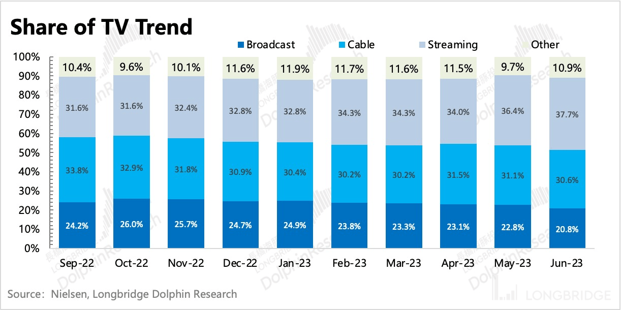 尼尔森数据显示,年初以来 TV 用户花在有线电视频道上的时长份额继续趋势性下滑。中长期来看,有线电视的广告收入将继续承压。