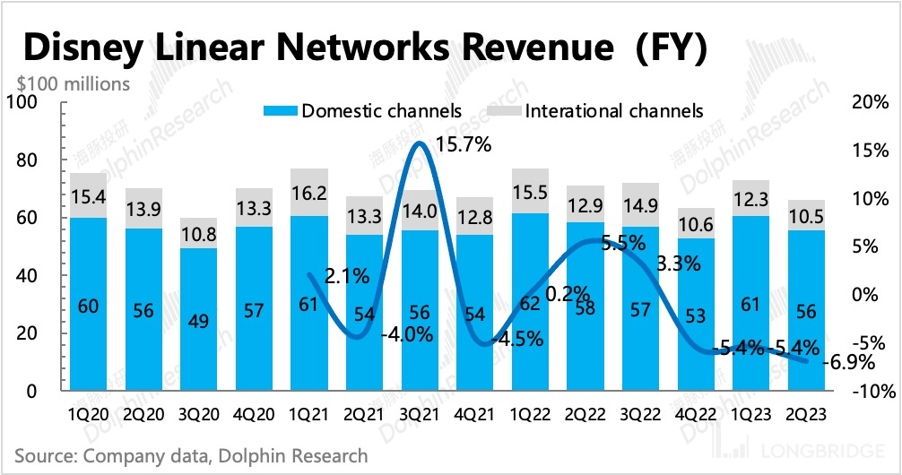 三季度有线电视收入同比下滑 7%,和上季度下滑幅度持平,主要下降的地方仍然是广告收入上(同比下滑 14%,上季度同比下滑 15%),这与用户观看时长相关性更大。订阅费和分发收入因为有付费惯性,流媒体对有线电视的影响还存在滞后,短期波动不会特别大,三季度(-3%)保持与二季度差不多的下滑幅度。