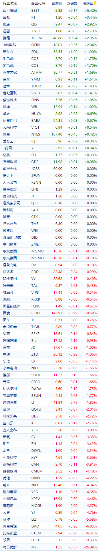 百家云涨8%,大健云仓涨超6%,百济神州、艮喜生物、小i机器人涨超4%,大全新能源、雾芯科技涨超3%,雅乐科技、趣店、BOSS直聘、晶科能源、量子之歌、迅雷、金融壹账通、携程、华住酒店集团、360数科涨超2%,陆金所控股、新东方、阿特斯、汽车之家、满帮、途牛、世纪互联、名创优品、玉柴国际、联拓生物、信也科技、优克联、微博涨超1%。