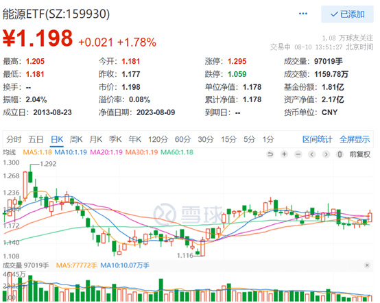 热门ETF方面,A股能源板块风向标——能源ETF(159930)冲高一度涨近2.4%,现涨1.78%,成交额近1200万元,上穿5日、10日、20日和30日均线!