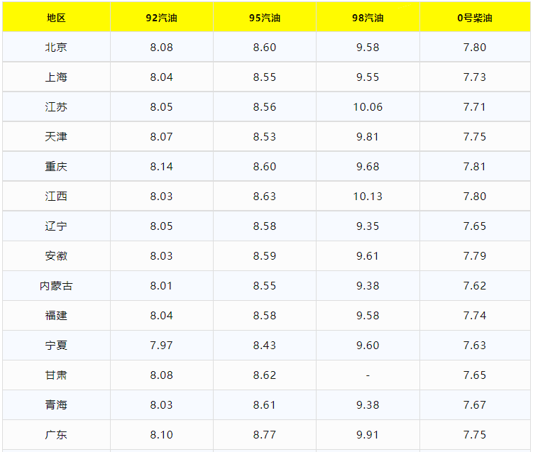 最后来看下国内油价:今天8月10日,下面我们来看一下部分地区汽柴油报价情况,浙江 今日温州、嘉兴92号汽油售价 8.04元/升; 95号汽油售价 8.55元/升; 0号柴油售价 7.73元/升;今日河南油价:今日郑州、洛阳0号柴油 7.94元/升;92号汽油 8.30元/升;95号汽油 8.87元/升;湖南 92号汽油价格 8.02元/升; 95号汽油价格 8.52元/升; 98号汽油价格 9.33元/升; 0号柴油 7.82元/升。