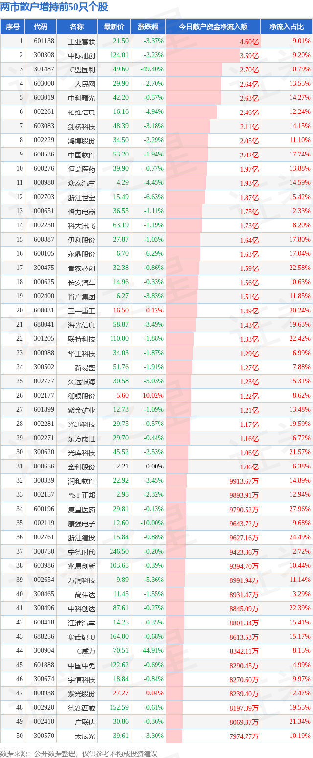 今天的市况大概如此,那么又有哪些公司受散户追捧呢?请看下表: