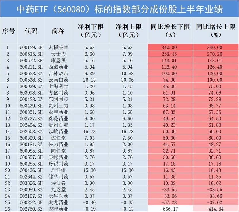 截至8月8日,中药ETF(560080)的标的指数成份股中,已有25家上市公司发布了半年度业绩预报或快报。太极集团以实现净利润归母净利润5.63亿元,同步增长340%,位列首位。天士力预计净利润约6.6亿元~7.09亿元,归母净利预增262%-274%;康恩贝、西藏药业、吉林敖东实现100%以上增速;云南白药、东阿阿胶、上海凯宝、亚宝药业、方盛制药等也都实现上半年净利增长!以下为截至8月8日已发布的业绩情况,板块业绩整体高增!