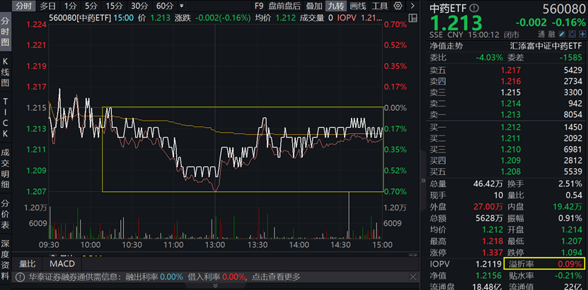 主流ETF方面,中药ETF(560080)早盘下探、午后拉升,跌幅有所收窄,截至收盘微跌0.16%,盘中溢价频现,收盘溢价率达0.09%,反映买盘强势,资金或逢跌布局!