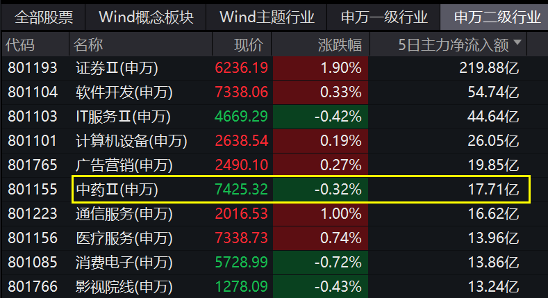 全市场来看,近期,中药板块获主力资金净流入额高居市场前列,近5日板块获主力净流入额17.7亿元,在124个申万二级行业中高居第六位!