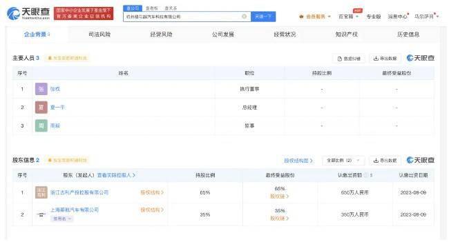 驱动中国2023年8月10日消息,天眼查App显示,8月9日,杭州极与越汽车科技有限公司成立,法定代表人、执行董事为张权,总经理为夏一平,注册资本1000万人民币,经营范围含新能源汽车整车销售、汽车销售、汽车零配件零售、电动汽车充电基础设施运营、电池销售、二手车经纪、数字技术服务等。股东信息显示,该公司由浙江吉利产投控股有限公司与百度旗下上海幂航汽车有限公司共同持股。