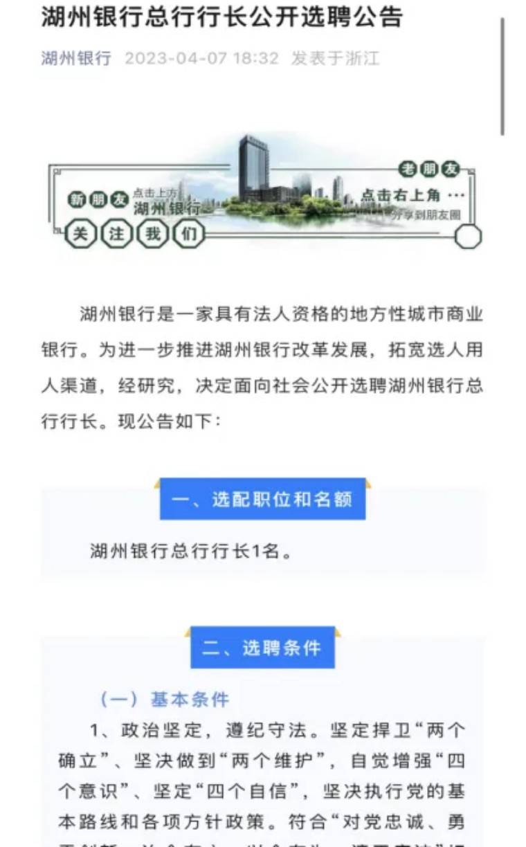 此后,湖州银行发布公告称,为进一步推进湖州银行改革发展,拓宽选人用人渠道,经研究,决定面向社会公开选聘湖州银行总行行长。