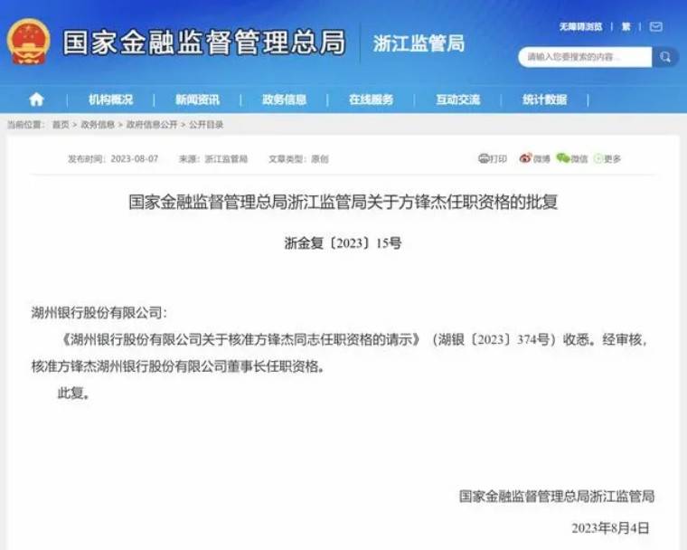 8月7日,国家金融监督管理总局浙江监管局披露的一则批复显示,核准方锋杰湖州银行股份有限公司董事长任职资格。