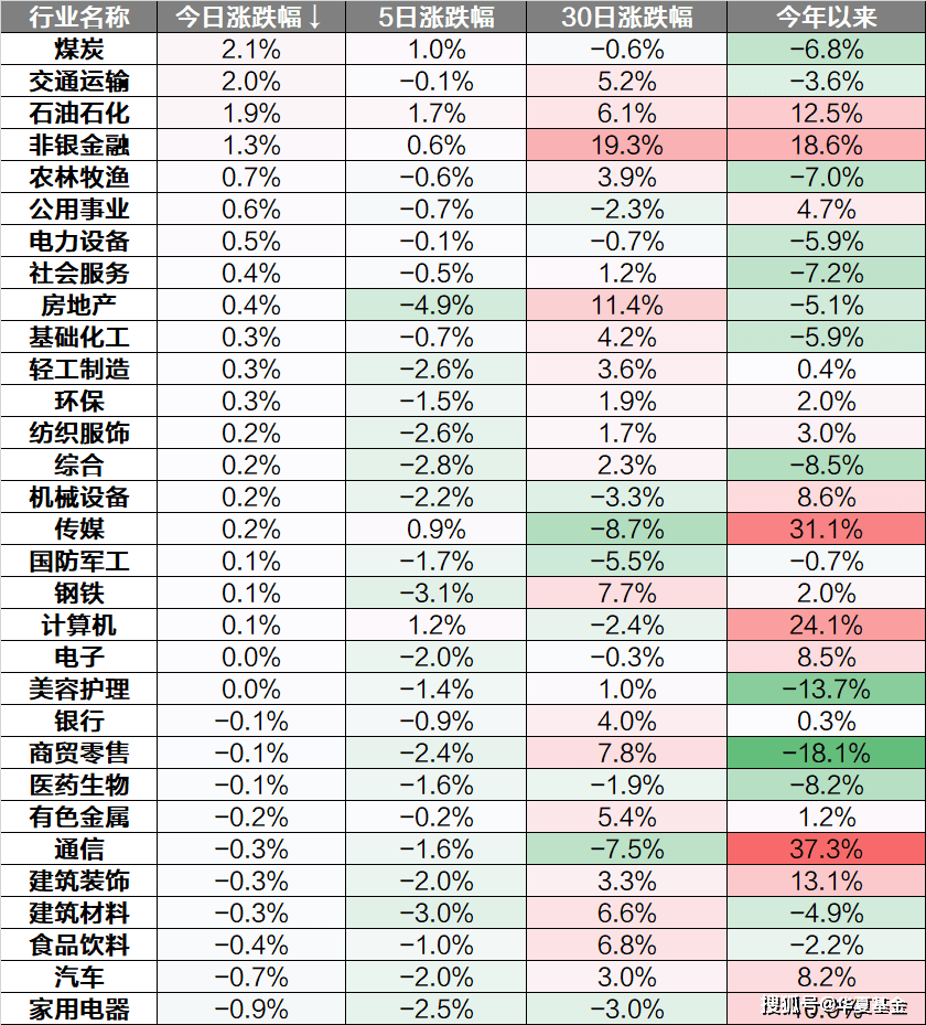 行业上来看,煤炭、交通运输、石油石化等上涨,食品饮料、汽车、家用电器等板块下跌。
