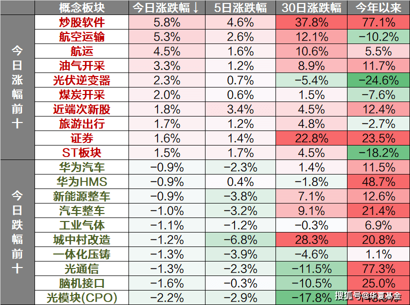 概念主题方面,炒股软件、航空运输、航运板块领涨,光通信、脑机接口、光模块(CPO)跌幅居前。