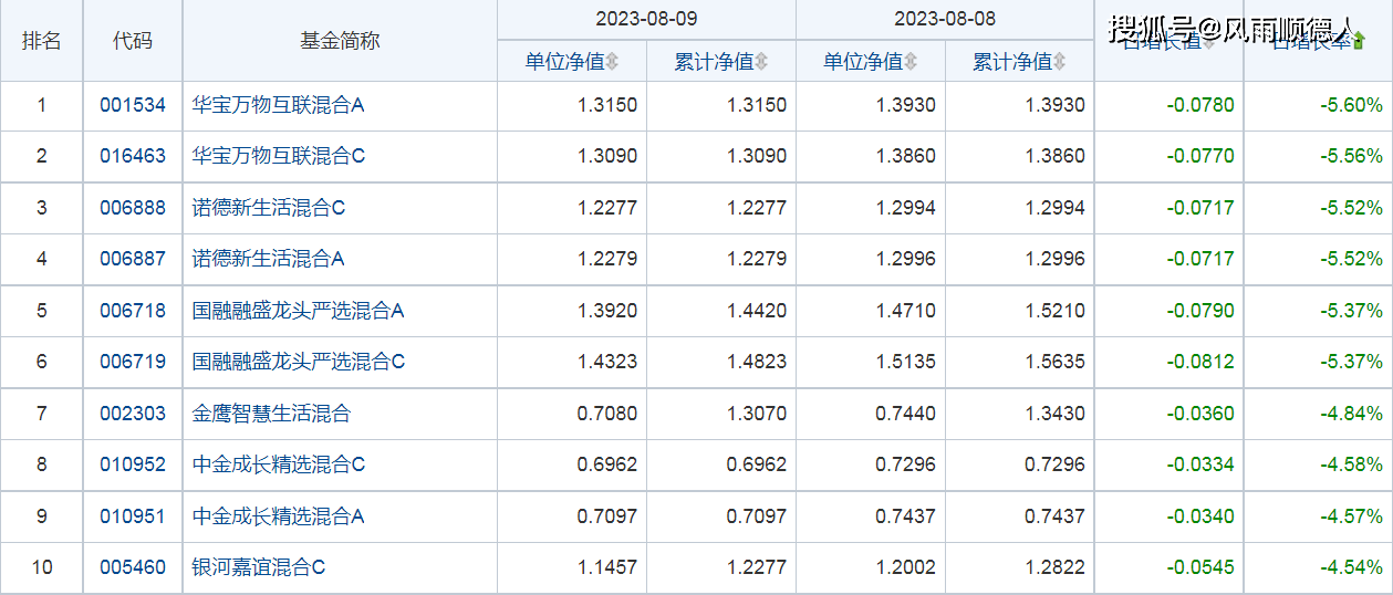 9日开放式基金净值增长排名后10的基金分别是:华宝万物互联混合A、华宝万物互联混合C、诺德新生活混合C、诺德新生活混合A、国融融盛龙头严选混合A、国融融盛龙头严选混合C、金鹰智慧生活混合、中金成长精选混合C、中金成长精选混合A、银河嘉谊混合C。