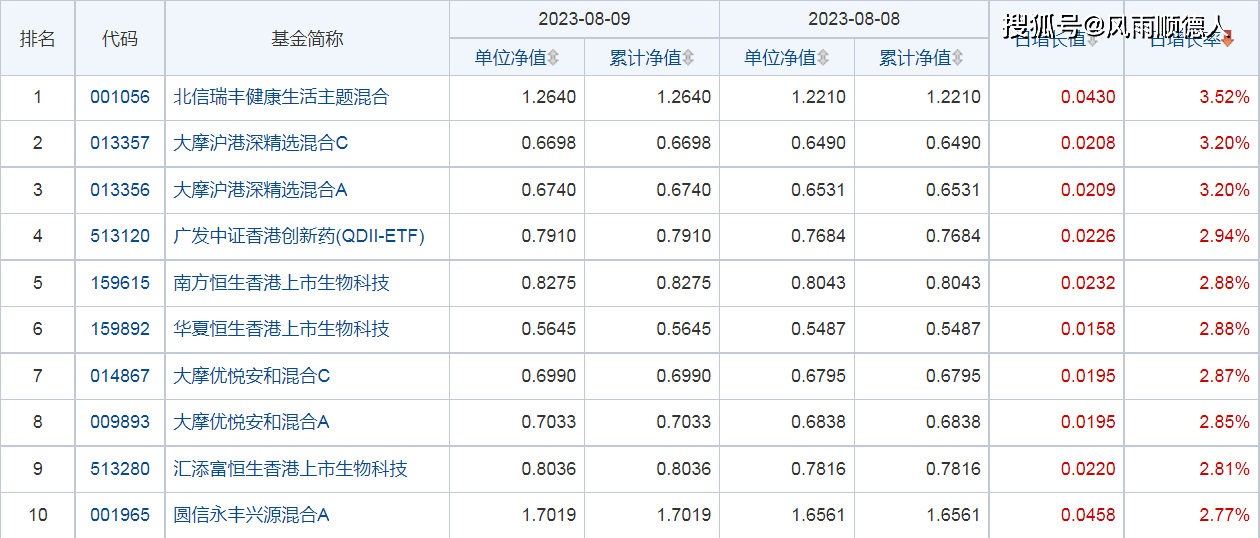 9日开放式基金净值增长排名前10的基金分别是:北信瑞丰健康生活主题混合、大摩沪港深精选混合C、大摩沪港深精选混合A、广发中证香港创新药(QDII-ETF)、南方恒生香港上市生物科技ETF(QDII)、华夏恒生香港上市生物科技ETF(QDII)、大摩优悦安和混合C、大摩优悦安和混合A、汇添富恒生香港上市生物科技ETF(QDII)、圆信永丰兴源混合A。