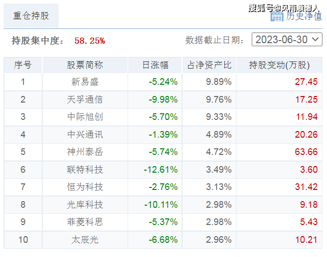 该基金的十大持仓中联特科技、光库科技跌幅逾10%,新易盛、天孚通信、中际旭创、神州泰岳、菲菱科思、太辰光跌幅较大,前十大持仓占总持仓54.13%,持股集中度:58.25%,持股集中度明显偏向光通信模块行业,基金净值相对跑输市场(属于CPO概念主动型混合基金)【基金规模1.23亿元】。