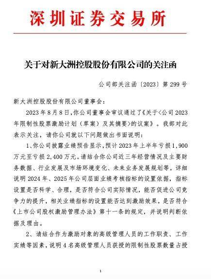 关注函称,2023年8月8日,新大洲A董事会审议通过了《关于<公司2023年限制性股票激励计划(草案)及其摘要>的议案》。深交所对此表示关注,请新大洲A就以下问题做出书面说明: