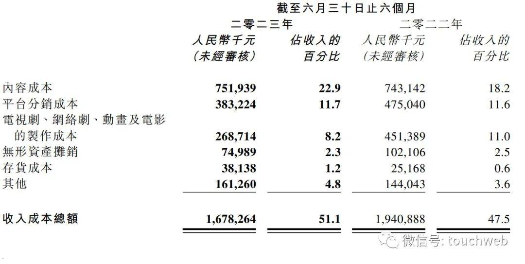 阅文集团2023年上半年成本为16.78亿元,上年同期的成本为19.4亿元;
