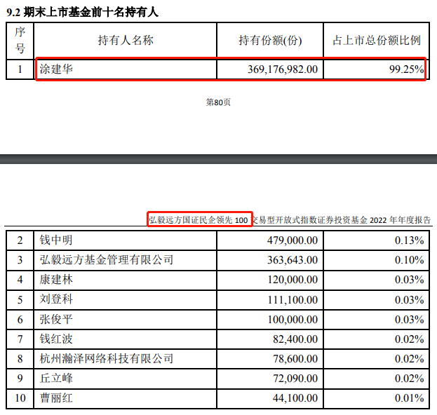 弘毅远方民企领先100ETF,规模是5.1亿元,他一个人就买了3.7亿份,价值5.02亿元,相当于为他一人定制的基金了。