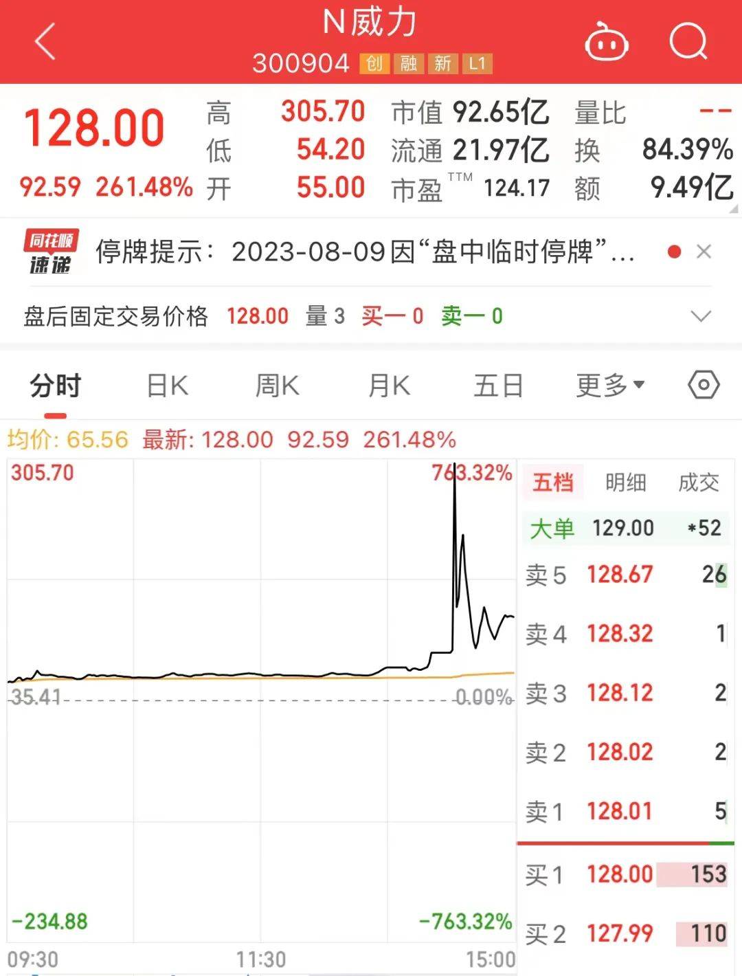 另外两只新股也同步拉升。N威力最高涨超760%,N威力是一只妥妥的“大肉签”,发行价为35.41元/股,发行市盈率为49.06倍,上市首日大涨261.48%。若在最高位抛出,中一签可赚超13万元。
