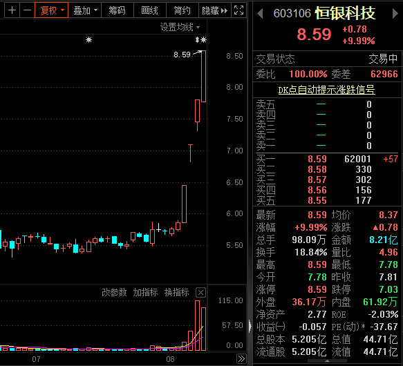 恒银科技作为金融科技龙头股,4个交易日以来放量大涨近50%。公司主营业务为金融智能终端设备的研发及制造。上半年,公司主要产品市场价格有所下降,且公司持续投入研发,研发费用等同比去年同期保持稳定,预计上半年度亏损4700万元到3960万元。