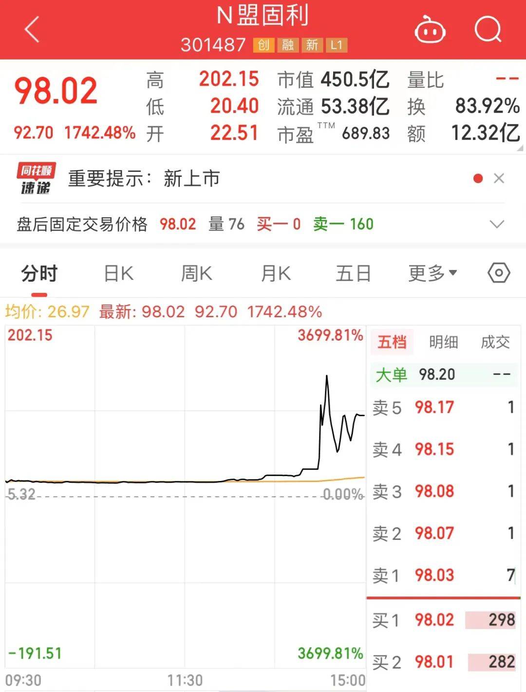 其中,创业板新股N盟固利表现最为亮眼,上市首日大涨1742.48%,盘中一度暴涨3699.81%,创A股历史上市新股首日盘中最大涨幅纪录。公司发行价为5.32元/股,以盘中最高价202.15元/股计算,中一签盈利近10万元。