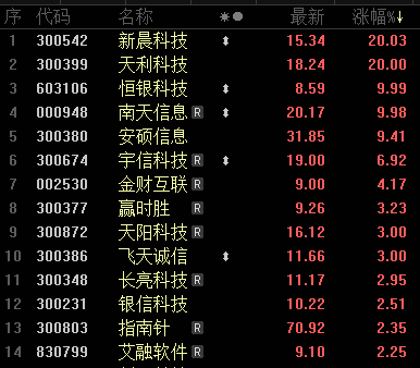 除3只新股外,金融科技概念股同样走强,新晨科技、天利科技均20cm涨停,恒银科技4连板,南天信息涨停,安硕信息、宇信科技、金财互联、长亮科技等纷纷跟涨。机构认为金融行业为信创行业的先行指标,信创行业已经进入订单爆发期。
