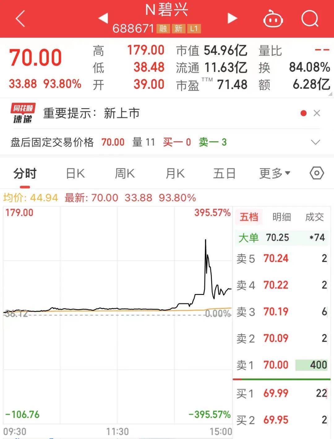 N碧兴最高涨近400%,收盘涨93.8%;若投资者在最高价抛出,亦可获利超7万元。