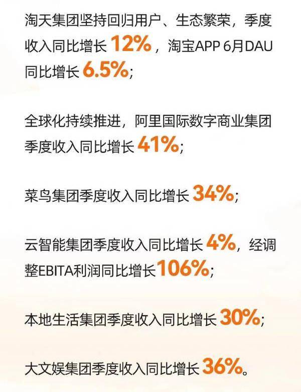 分开来看,淘天集团坚持回归用户、生态繁荣,季度收入相比去年同期增长12%,淘宝APP的2023年6月日活跃用户相比去年同期增长6.5%;阿里国际数字商业集团持续推进全球化,最新季度收入相比去年同期增长41%;菜鸟集团的季度收入相比去年同期增长了34%;云智能纪元的季度收入相比去年同期增长了4%,经调整EBITA利润相比去年同期增长106%;本地生活集团的季度收入相比去年同期增长30%;大文娱集团的季度收入相比去年同期增长36%。