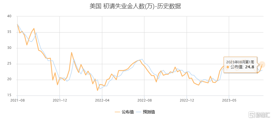 同日消息,美国至8月5日当周初请失业金人数录得24.8万人,高于预期的23万人和前值22.7万人。