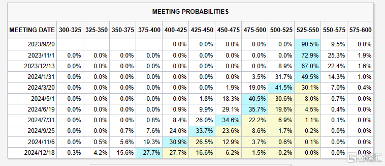 据CME“美联储观察”,美联储9月维持利率在5.25%-5.50%不变的概率为90.5%,加息25个基点至5.50%-5.75%区间的概率为9.5%;到11月维持利率不变的概率为74.7%,累计加息25个基点的概率为23.7%,累计加息50个基点的概率为1.7%。