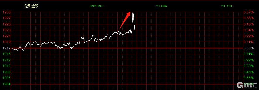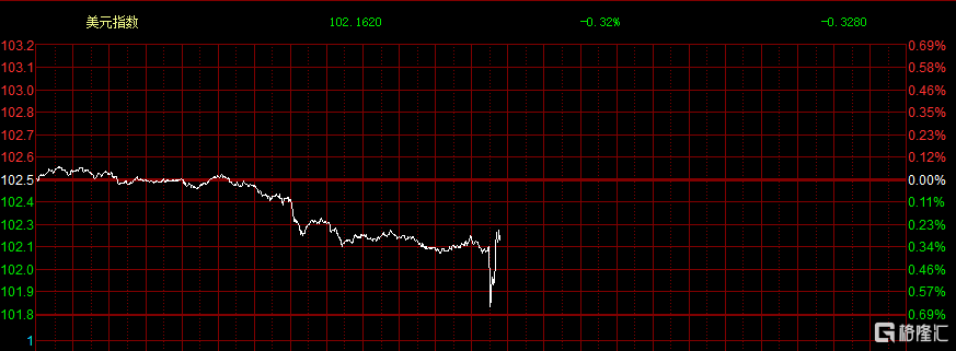 美元指数DXY短线一度下挫逾20点,现报102.15。现货黄金短线一度走高6美元,随后有所回落,现报1923.44美元/盎司。