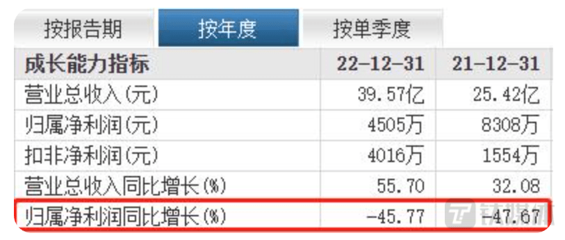2022年年报显示,公司实现营业总收入39.57亿元,同比增长55.70%;归母净利润4504.84万元,同比下降45.77%,出现增收不增利的现象。
