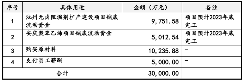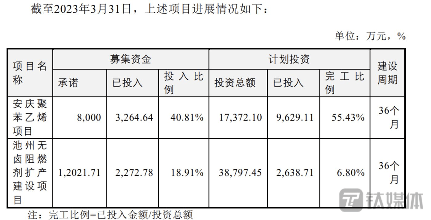 据了解,2021年4月,公司为完善产业链结构,落地自主研发储备项目,公司拟在安徽省池州东至经济开发区建设池州化工新材料生产基地,项目总投资12亿元,分两期建设。第一期建设周期为3年,其中拟使用超募资金投资池州无卤阻燃剂项目(项目一)和安庆聚苯乙烯项目(项目二)。