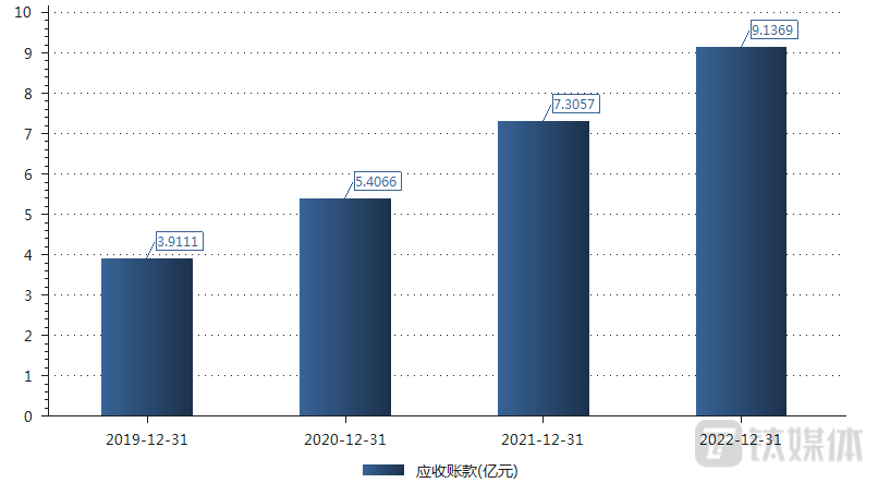 实际上,近年来由于竞争加剧,资金回笼较慢,公司应收账款逐年增加。数据显示,2020年—2022年,公司的应收账款分别为5.4亿元、7.3亿元、9.13亿元。