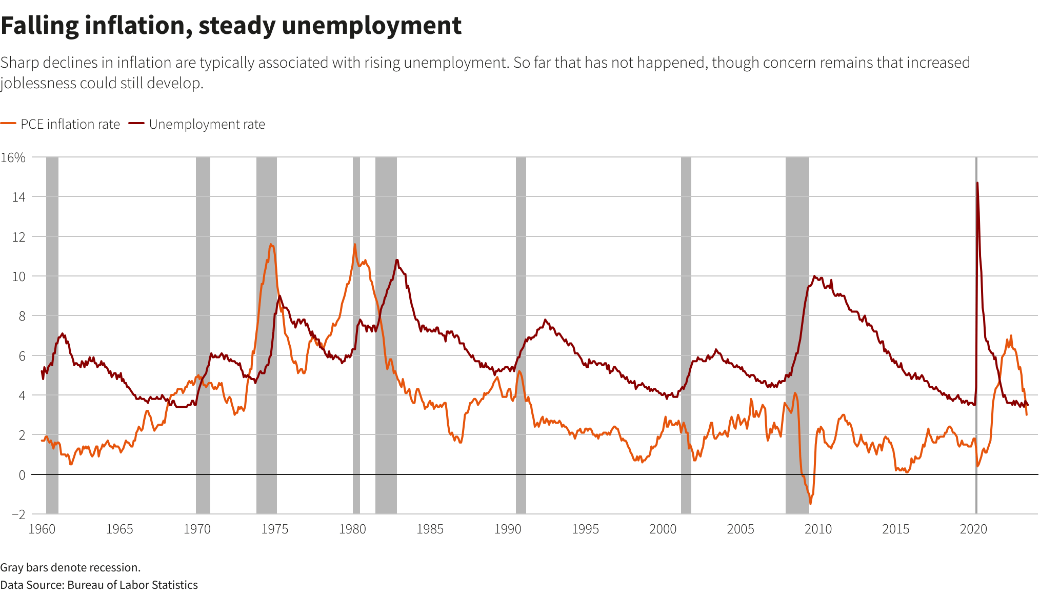 通常情况下,随着企业和消费者缩减开支,失业率将会上升。然而,自2022年2月以来,失业率一直保持在4%以下,上个月还意外降至3.5%。