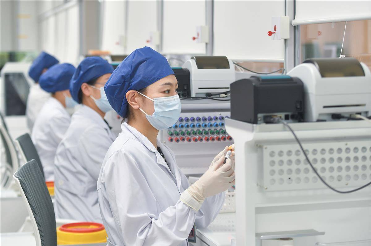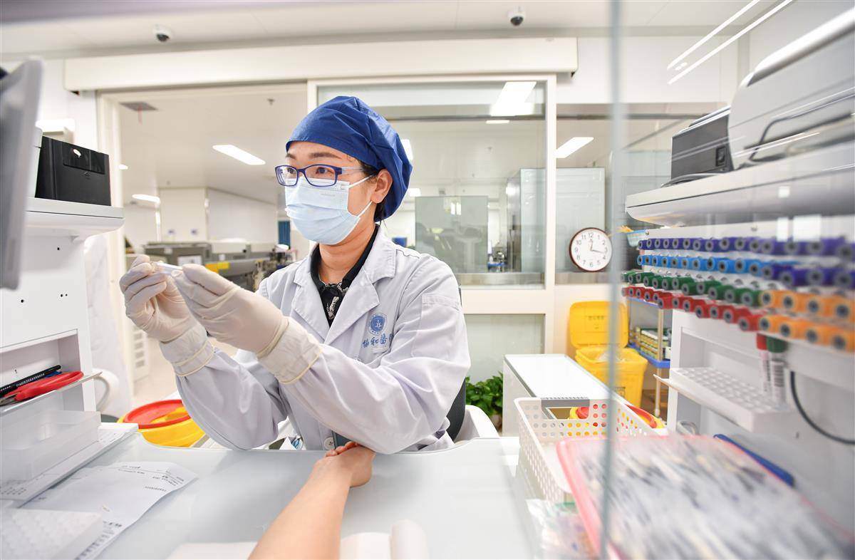 在二楼的检验科,智能采血系统已“上岗”。该科负责人邢辉介绍,采血叫号、贴标、标本传输、分拣都由“机器人”操控,采集后的血液标本坐着“轨道车”瞬间送到目的地做检测。患者只需一次扫码排号即可完成,减少了排队次数,自助报告机最快可20分钟拿取报告。