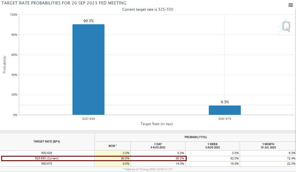 芝商所(CME)的“美联储观察工具”显示,本周四美股盘中,美国联邦基金利率期货交易市场预计,9月美联储保持利率不变的概率超过90%,高于一天前的86%。