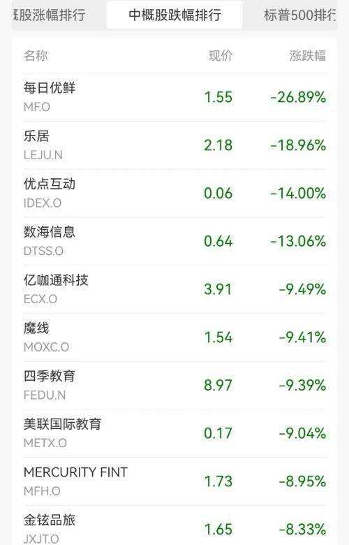 跌幅方面,每日优鲜跌26.89%,乐居跌18.96%,优点互动跌14.00%,领跌中概股。