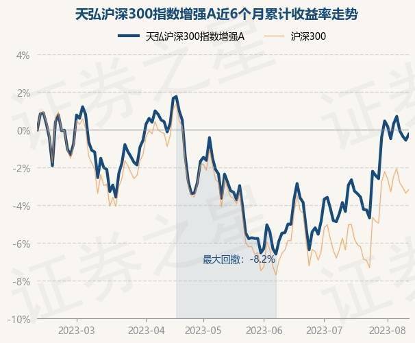 8月10日,天弘沪深300指数增强A最新单位净值为1.2186元,累计净值为1.2186元,较前一交易日上涨0.32%。历史数据显示该基金近1个月上涨4.41%,近3个月上涨1.9%,近6个月下跌0.21%,近1年下跌1.82%。该基金近6个月的累计收益率走势如下图: