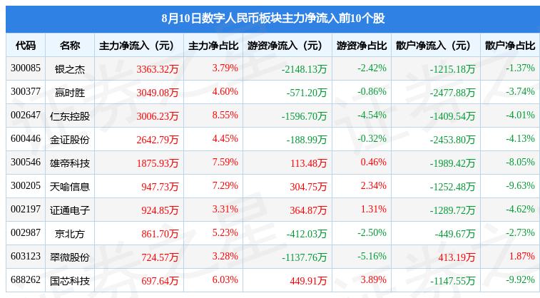 从资金流向上来看,当日数字人民币板块主力资金净流出7.01亿元,游资资金净流出5524.41万元,散户资金净流入7.56亿元。数字人民币板块个股资金流向见下表: