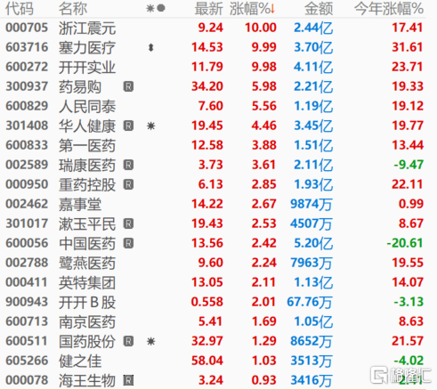 浙江震元、塞力医疗、开开实业等涨停,药易购、人民同泰、华人健康等跟涨。