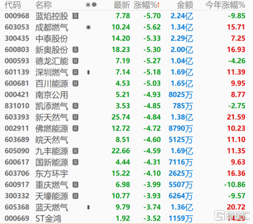 成都燃气跌超5%,德龙汇能、蓝天燃气、新奥股份、佛燃能源、南京公用等纷纷跟跌。