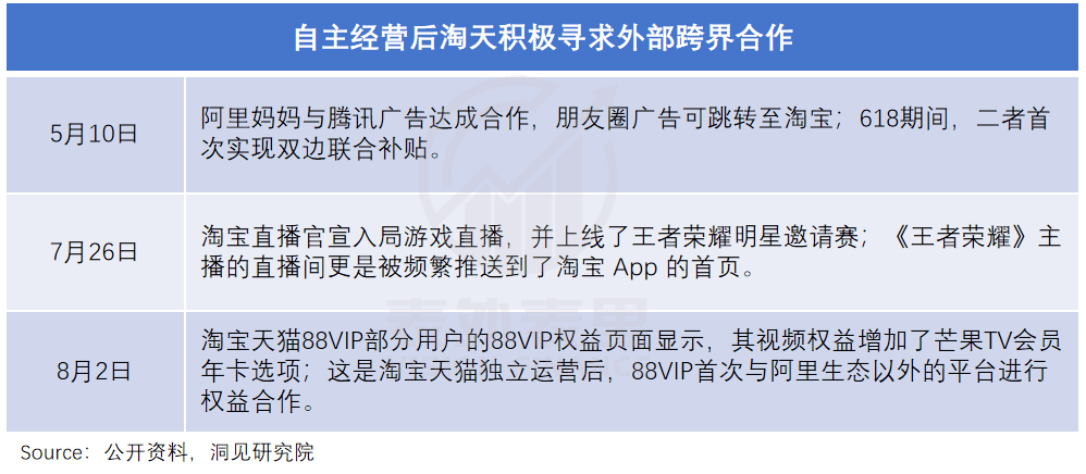 解绑后的淘天,还将合作的触角伸到了外部。比如,芒果TV作为首个阿里生态外的平台,和88VIP实现合作。要知道,此前88VIP只有集团内兄弟可以上桌。
