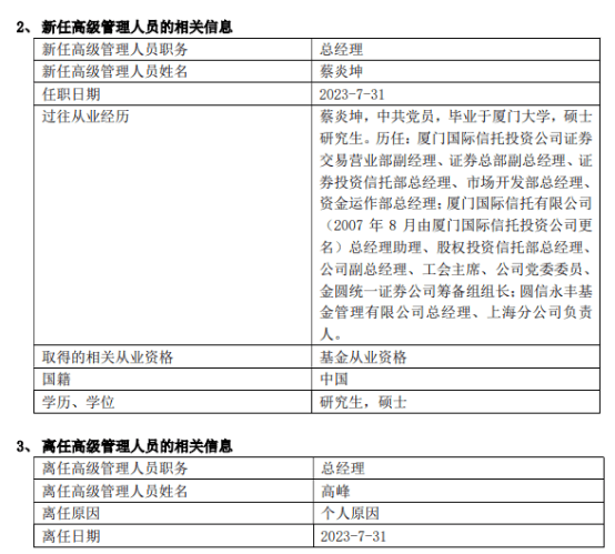 而在这之后不到一年,2023年7月31日,高峰也因个人原因离任,同日上任的是圆信永丰基金的前总经理蔡炎坤。